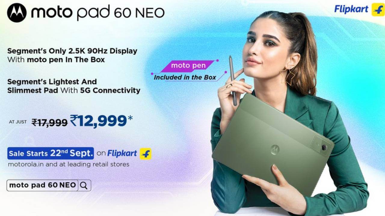 नई दिल्ली: Motorola ने इंडिया में अपना नया moto pad 60 NEO लॉन्च कर दिया है, जो स्टाइल, परफॉर्मेंस और कनेक्टिविटी का दमदार कॉम्बिनेशन है। कंपनी का दावा है कि यह अपने सेगमेंट का सबसे स्लिम और लाइटवेट 5G-रेडी टैबलेट है। 7040mAh बैटरी से पावरफुल बैकअप दिया गया है, जो एक बार चार्ज करने पर करीब 12 घंटे तक स्ट्रीमिंग का बैकअप देती है।