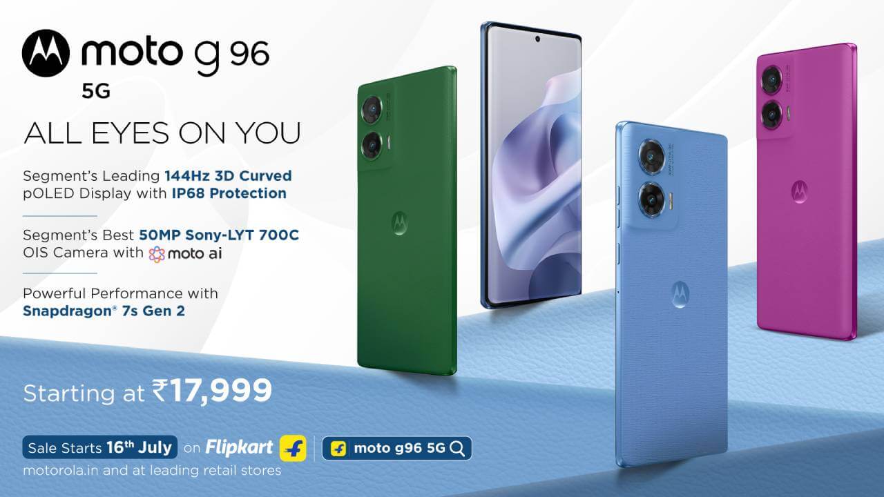 फोन में Dual Stereo Speakers, Dolby Atmos, Hi-Res Audio और Moto Spatial Sound है। चार शानदार रंगों Ashleigh Blue, Greener Pastures, Cattleya Orchid और Dresden Blue में लॉन्च किया गया है moto g96 5G दो स्टोरेज वेरिएंट्स में मिलेगा: 8GB + 128GB की कीमत 17,999 रुपये रखी गई है। 8GB + 256GB का फोन 19,999 रुपये में मिलेगा। सेल 16 जुलाई 2025 को दोपहर 12 बजे से Flipkart, Motorola.in और सभी प्रमुख रिटेल स्टोर्स पर शुरू होगी।