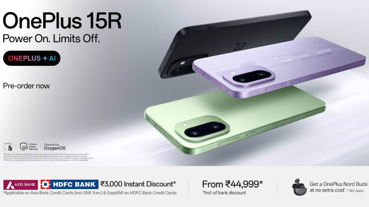प्री-बुकिंग पर OnePlus Nord Buds 3 (2,299 रुपये) मुफ्त मिल रहे हैं। HDFC/Axis बैंक कार्ड पर ₹3,000 इंस्टेंट डिस्काउंट और 6 महीने नो-कॉस्ट EMI का लाभ भी उपलब्ध है। 180 दिन में फोन रिप्लेसमेंट और लाइफटाइम डिस्प्ले वारंटी भी है। OnePlus 15R दमदार 7,400 mAh बैटरी, 165Hz AMOLED डिस्प्ले और स्मार्ट AI फीचर्स के साथ आता है। गेमिंग, फोटोग्राफी और मल्टीटास्किंग के लिए यह स्मार्टफोन सबसे परफेक्ट पैकेज है।